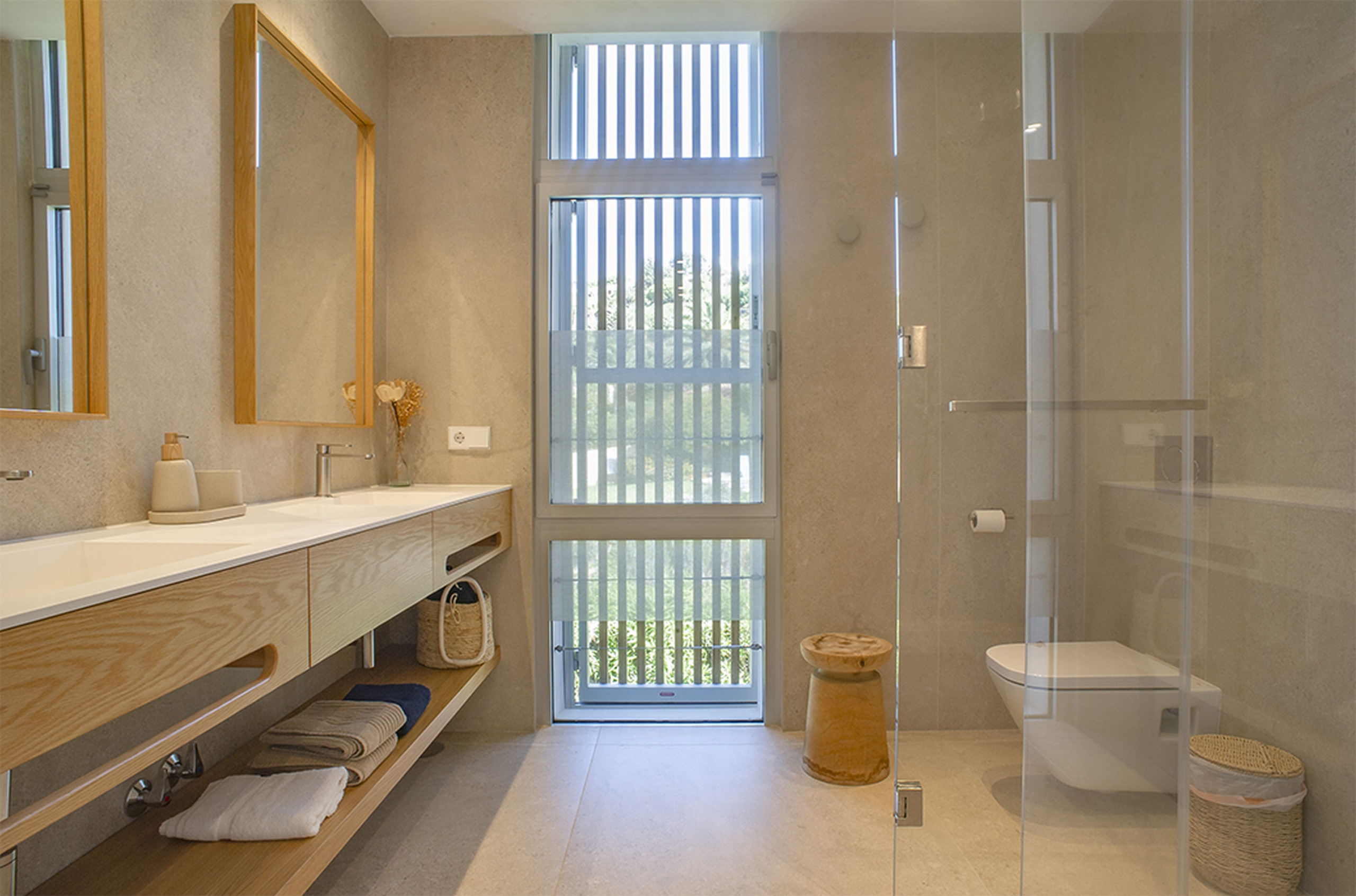 Arriba, cuatro dormitorios con baño en suite ofrecen descanso y vistas de postal: dos con camas dobles y panorámica al mar, y dos con camas individuales que miran al jardín y la montaña. Desde aquí, asciende a la azotea y descubre el verdadero espectáculo: el mar y la montaña extendiéndose hasta donde alcanza la vista, el lugar ideal para brindar al atardecer.