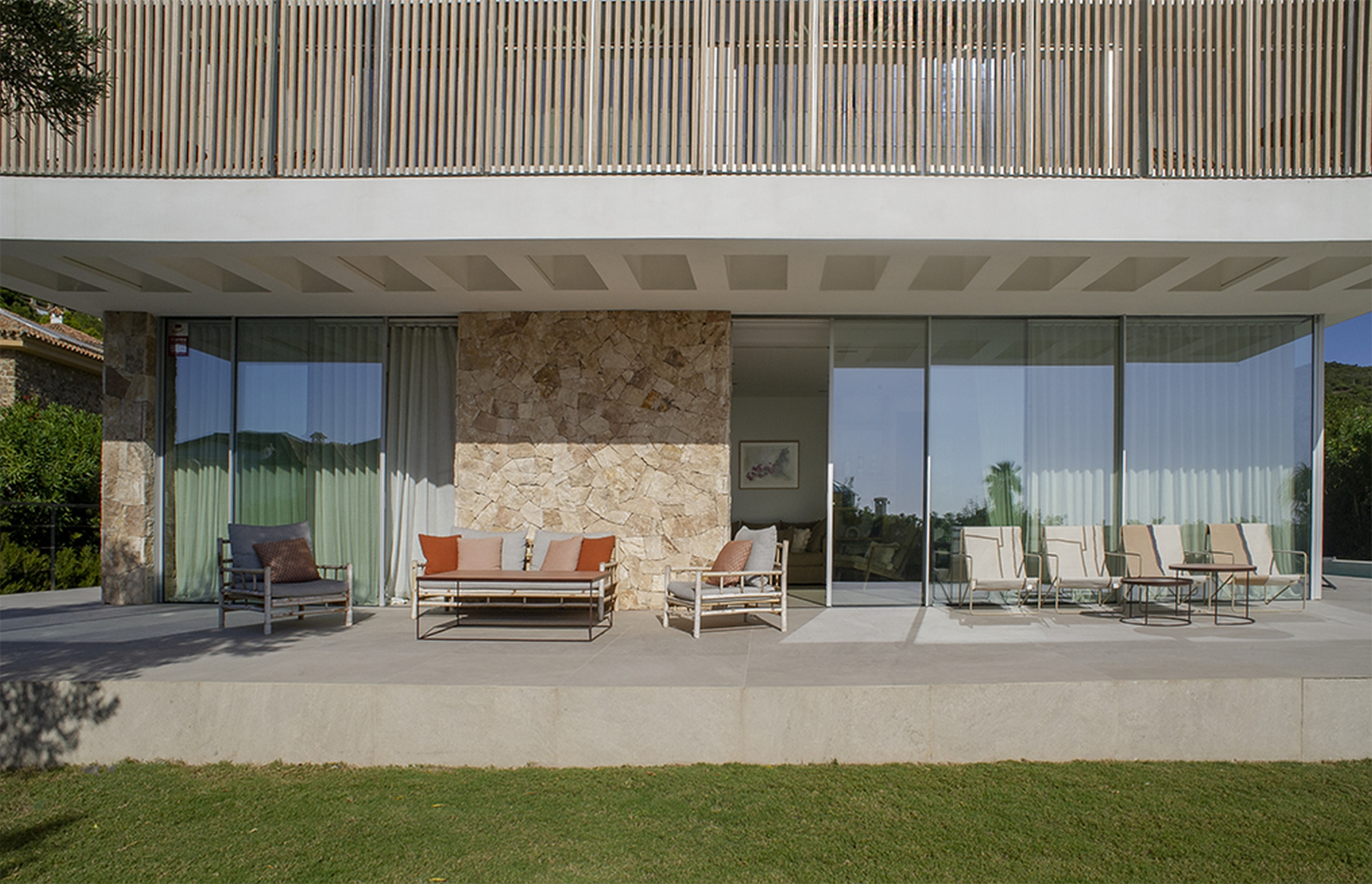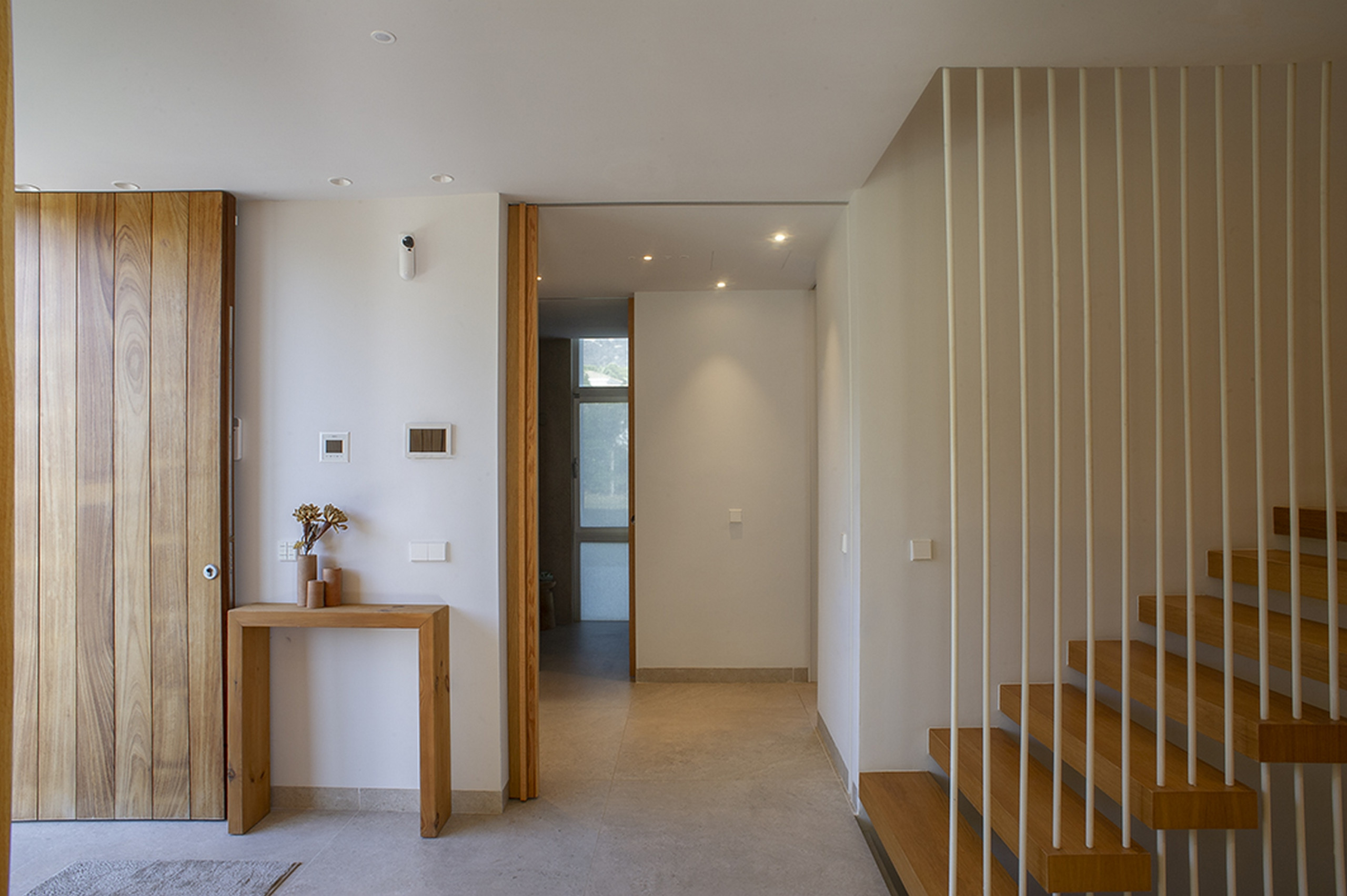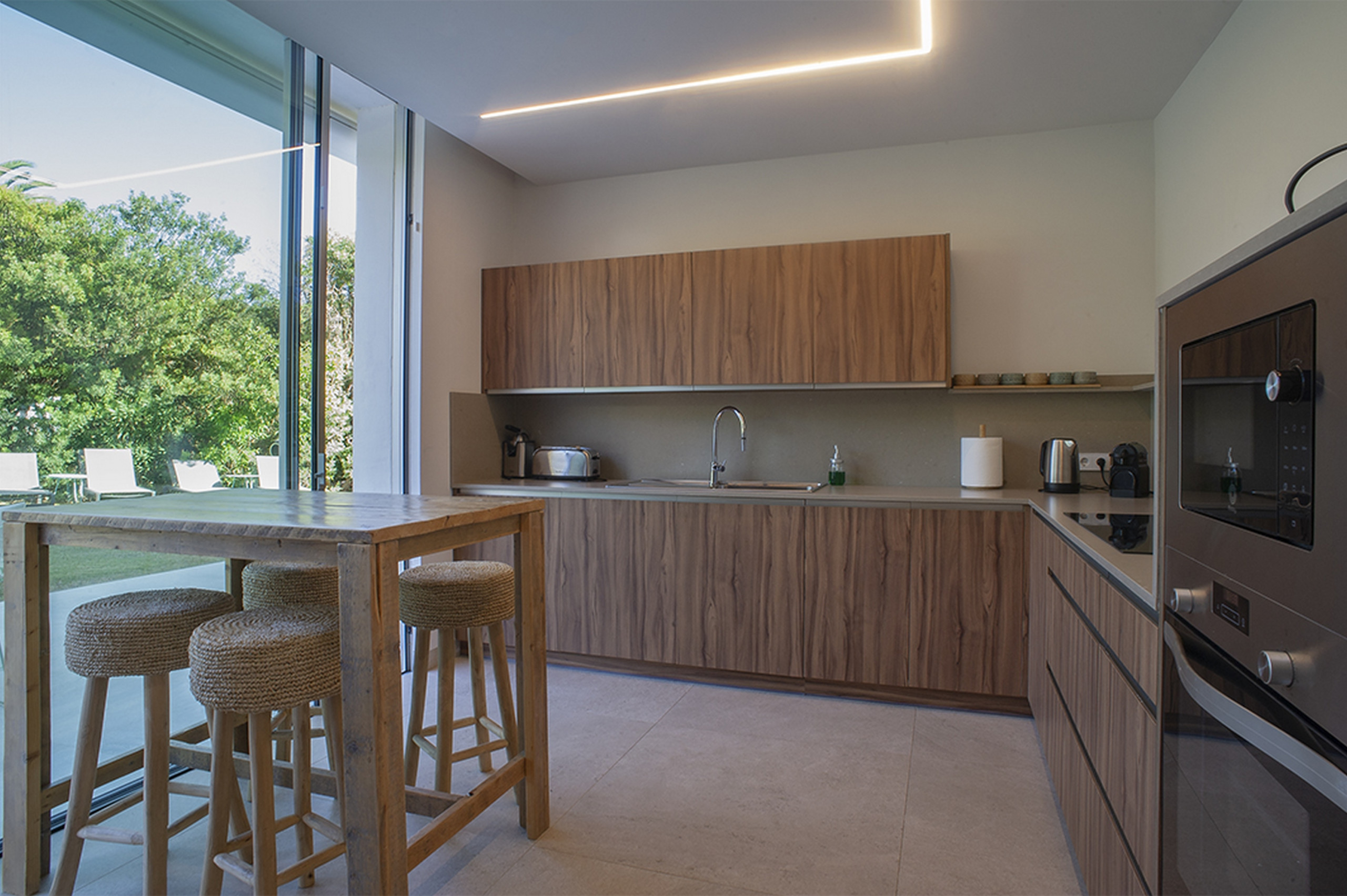 En la planta principal, un salón-comedor inundado de luz se abre directamente al porche y la zona de piscina. Aquí, las fronteras entre interior y exterior desaparecen. Una acogedora sala de estar, perfecta para desconectar, y una cocina de ensueño —totalmente equipada— conducen a un elegante comedor al aire libre con mesa, toldo eléctrico y sombrillas, el escenario perfecto para largas cenas bajo las estrellas. Un baño completo con ducha añade comodidad a este nivel.